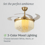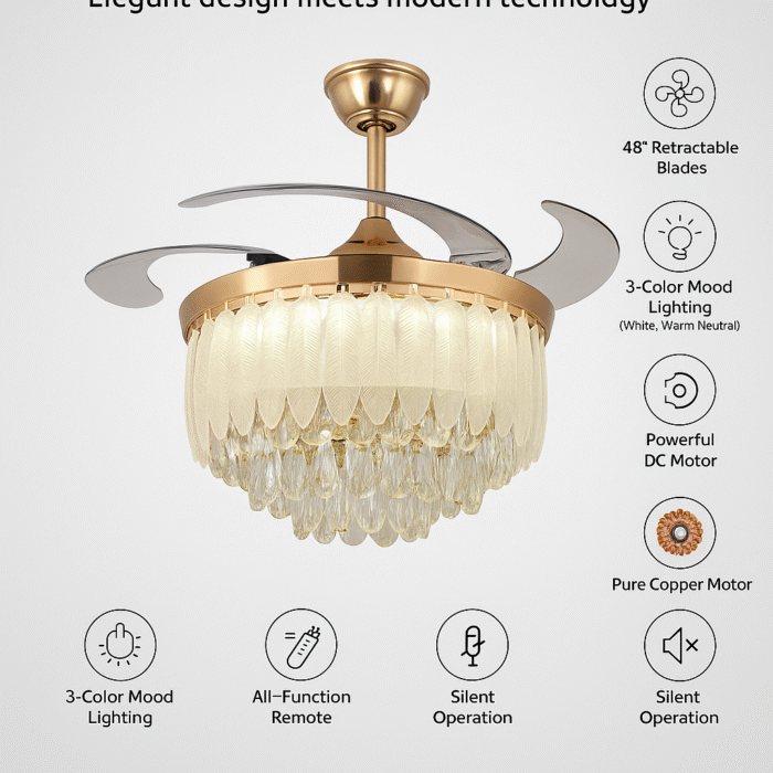 Redefine elegance in your home with the Feather Chandelier Fan, a perfect blend of luxury lighting and modern cooling. Designed to impress, it combines a dazzling chandelier with a powerful, silent ceiling fan for year-round comfort.